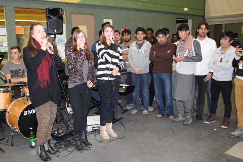 Die Reaktionen des Publikums sind unterschiedlich: Die einen stehen neugierig in der ersten Reihe und wippen mit, andere halten sich eher skeptisch im Hintergrund. Mit Handys werden die ungewohnten Gäste gefilmt, und die die Barrieren sinken im Laufe des Abends. Gegen später drängt es auch einige der Flüchtlinge selber auf die imrpovisierte Bühne unter dem Basketballkorb: Eine Gruppe Afghanen hat traditionelle Musik aus ihrer Heimat auf ihren Handys gespeichert, über den Verstärker der Band erklingt sie jetzt – und dazu wird munter getanzt. Danach gibt’s eine gemeinsamen Tee – für die deutschen Musiker und für ihr Publikum aus aller Welt. So wird aus dem Konzert auch gleich ein Begegnungsabend.